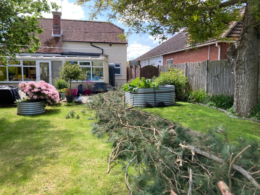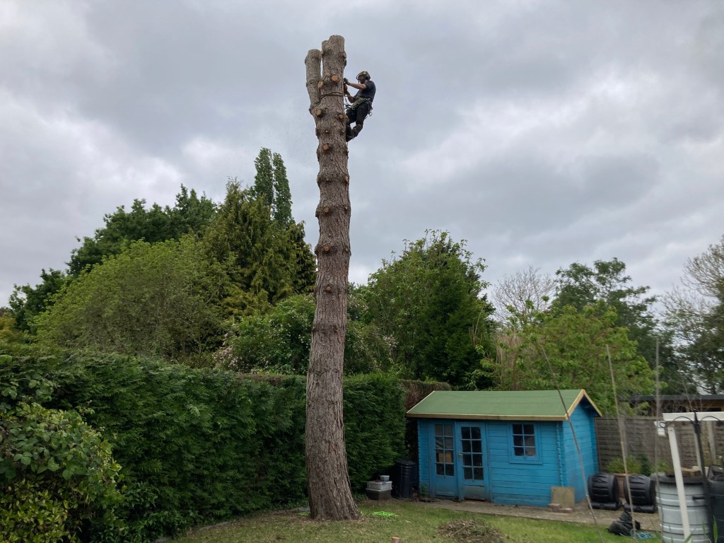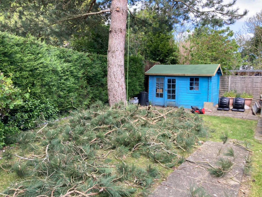 Some tree surgeons might look at a huge pine tree in the back of a garden of a small suburban home in Bury St Edmunds, with a long and awkward drag, as a job that just isn’t worth it. But not the team at DJP Tree Services. With Duncan’s 15 years’ experience working on some of the tallest trees in the world on the west coast of Canada and some of the smallest and most awkward in the UK, we took this behemoth on in a day, opening up the garden to light and keeping all the neighbours happy.